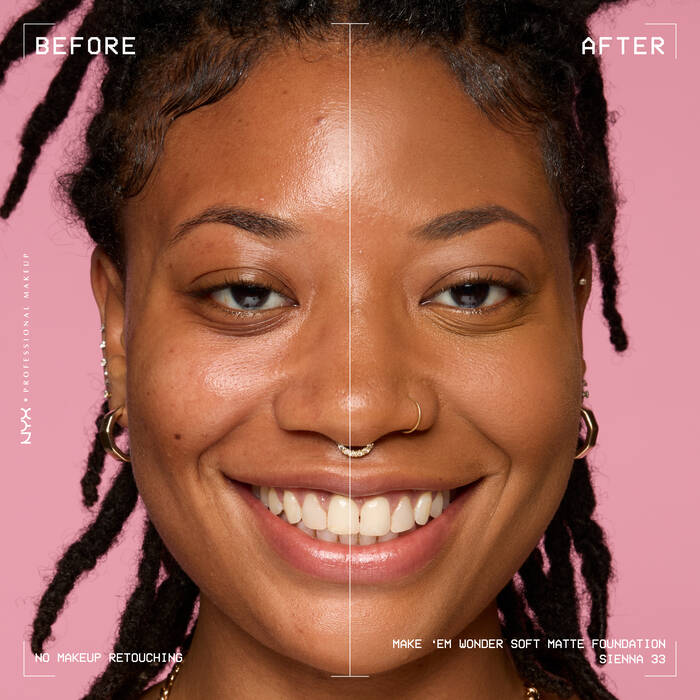 Meet your new foundation essential: Make ’Em Wonder™ Soft Matte Foundation, a skincare-infused soft matte foundation that delivers pro-level coverage with a real-skin finish. Infused with Vitamin C from Guarana Seed Extract and Hyaluronic Acid, this hydrating foundation brightens, smooths, and perfects while feeling weightless on skin. The buildable formula blends seamlessly for a flawless, soft-matte look that lasts up to 24 hours with fade, transfer, sweat, and water resistance for all-day shine control. Available in 45 true-to-skin, undetectable shades, it enhances your complexion without masking your natural beauty.